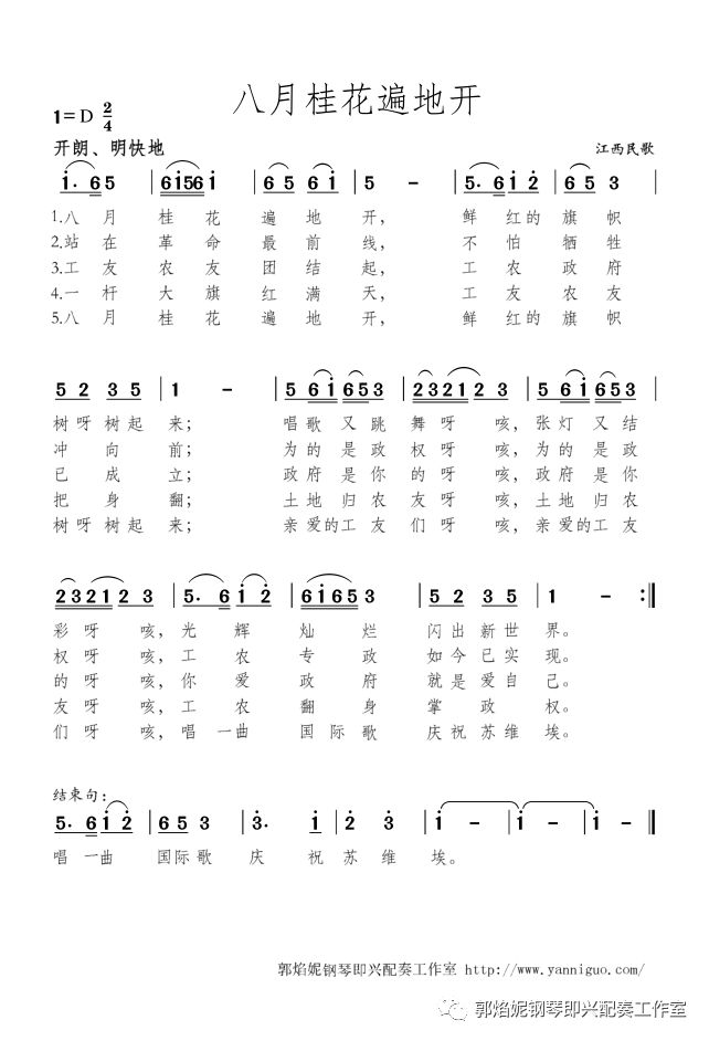 中国民族五声调式,包含宫、商、角、徵、羽五种调式。其中 ,宫调式与大调式有许多相似之处,也有不同。尤其原生态的五声宫调式歌曲,其风格与大调式有很多差异。这首经典的《八月桂花遍地开》,歌曲调式为五声宫调式,作为初学民族五声调式即兴配奏的入门歌曲,大家听听,不同的人即兴配奏同一首歌有着怎样的个性化表现?!