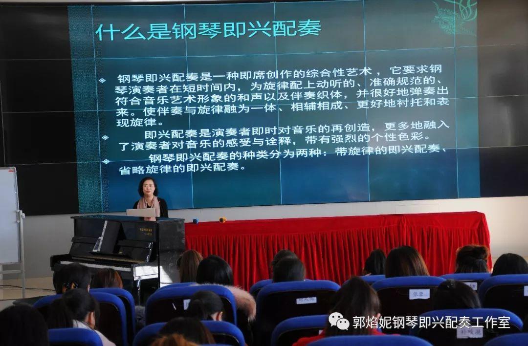 讲座中,郭老师简明生动地介绍了什么是钢琴即兴配奏?学习即兴配奏的基础、弹好即兴配奏的要领等。并结合大量中小学音乐教材歌曲,深入浅出地重点讲解了钢琴即兴配奏的常用和声语言(正三和弦、副三和弦、副属七和弦SD7、DD7),以及常用伴奏织体的运用。