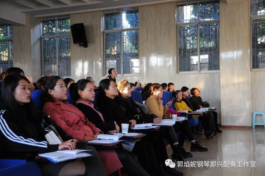 由凉山州教育局组织、凉山州小学教师培训中心主办的凉山州17个县(市)小学音乐骨干教师培训,近期在西昌举行。四川音乐学院钢琴系郭焰妮老师受邀于2018年12月01日至12月02日,在西昌市第四小学多媒体会议厅,为全体参加培训的音乐教师举行了题为《钢琴即兴配奏基础技术在中小学音乐教材歌曲中的应用》的专题学术讲座。