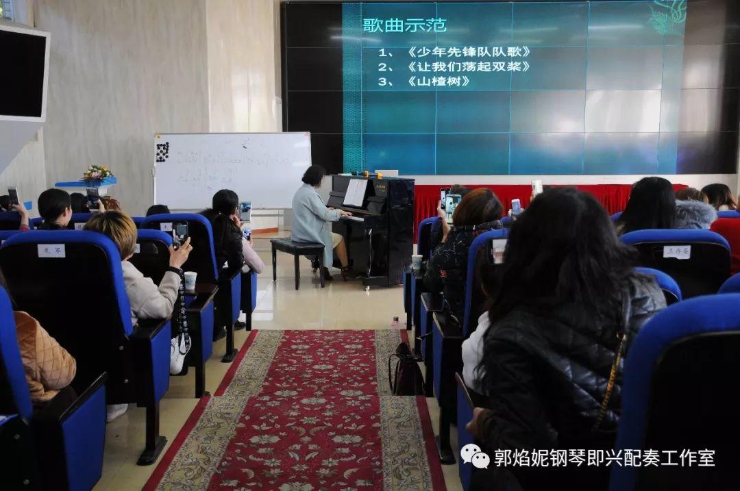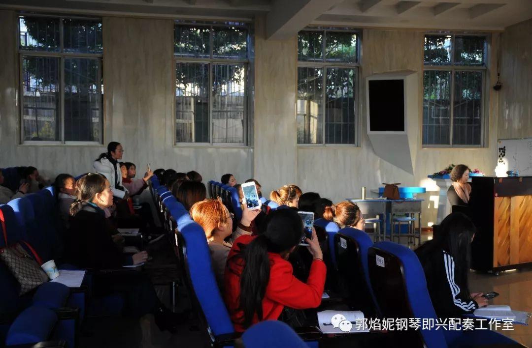 整个讲座过程中,郭老师一边讲一边做了多达30多首歌的精彩示范,如:《小小少年》、《七子之歌》、《妈妈格桑拉》、《少先队队歌》、《白桦林》、《红星歌》等。美妙动人的即兴配奏琴声加上生动、风趣的讲解,将在场的所有教师都深深吸引住了,学员们不时报以热情的掌声。